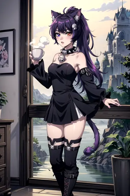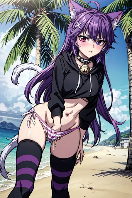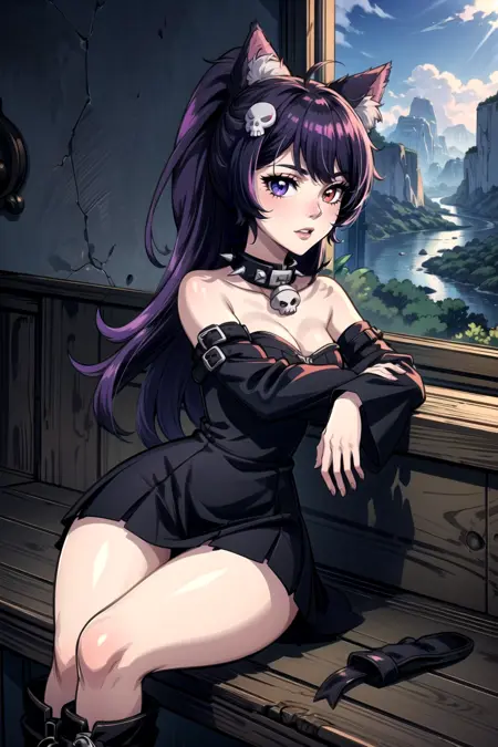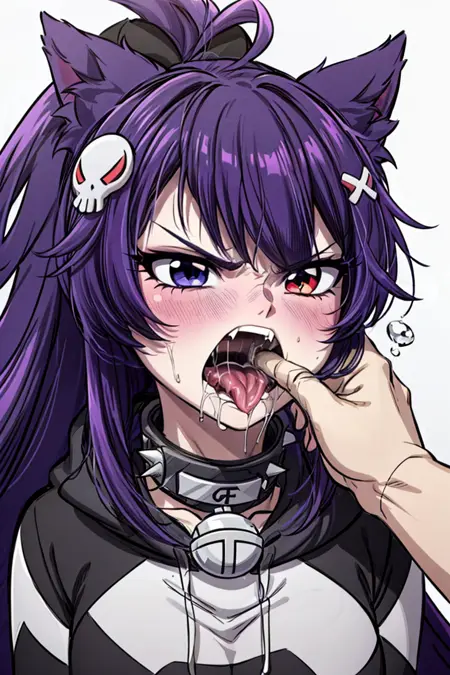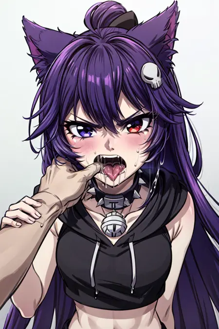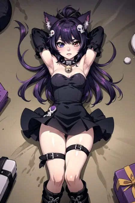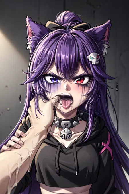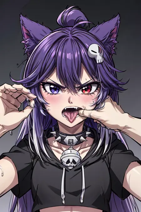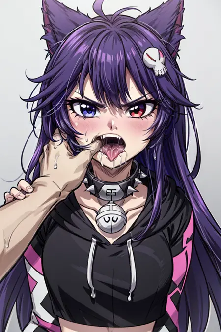 totless: catgirl, heterochromia, long hair, dark purple hair, animal ear fluff