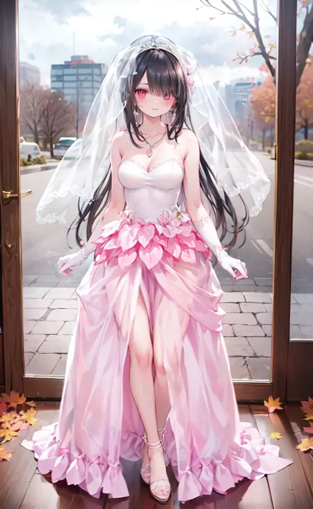 使用触发词:tokisakiweddingv1, pink strapless dress, long dress, ring, necklace, long hair, lace trim, jewelry, hair over one eye, pink elbow gloves, earrings, collarbone, cleavage, bridal veil, black hair, bare shoulders, narrow shoulders,