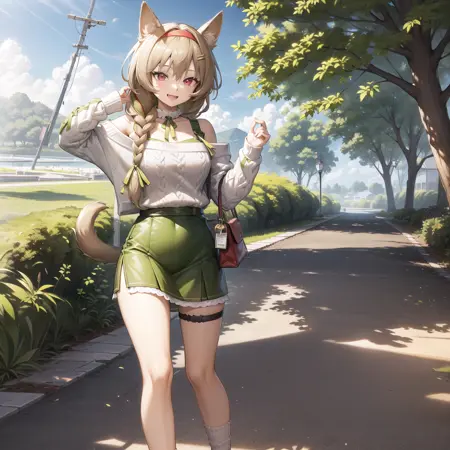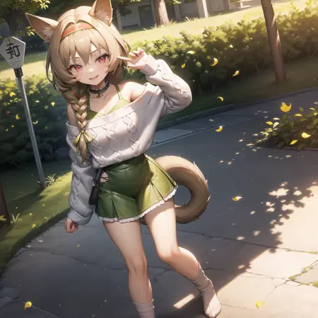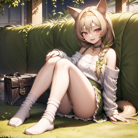 (liwu:1.3),white sweater,off-shoulder sweater,green dress,white socks,no shoes,green hairband,brown hair,single braid,red eyes,animal ears