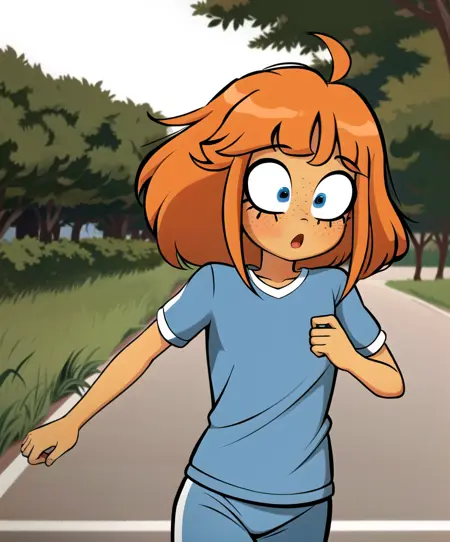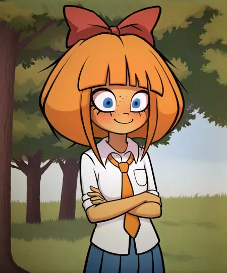 mymy, orange hair, short hair, bangs, blunt bangs, freckles, orange skin, colored skin, red bow, hair bow, blue eyes, wide-eyed, long eyelashes,
