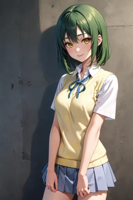 SakuragaokaSummer, sakuragaoka high school uniform, sweater vest, neck ribbon, short sleeves, grey skirt