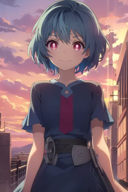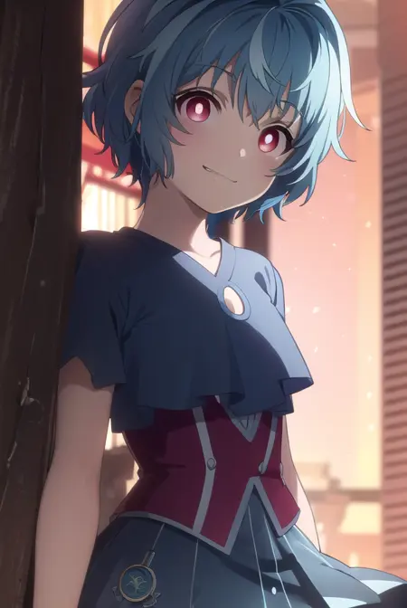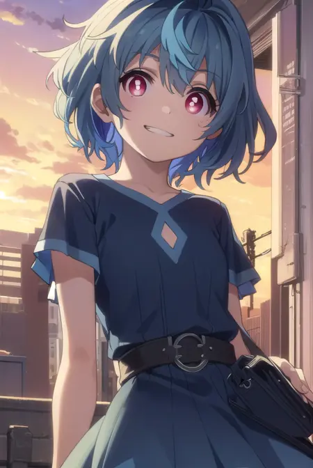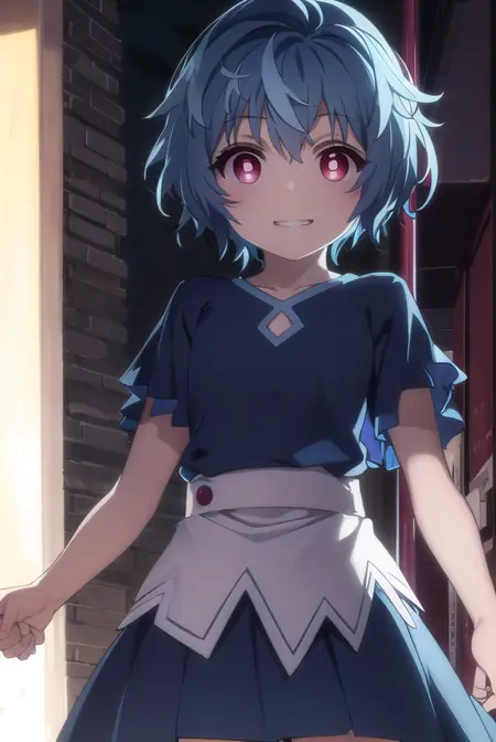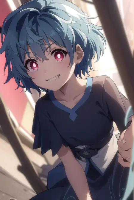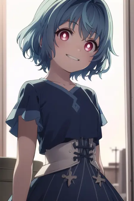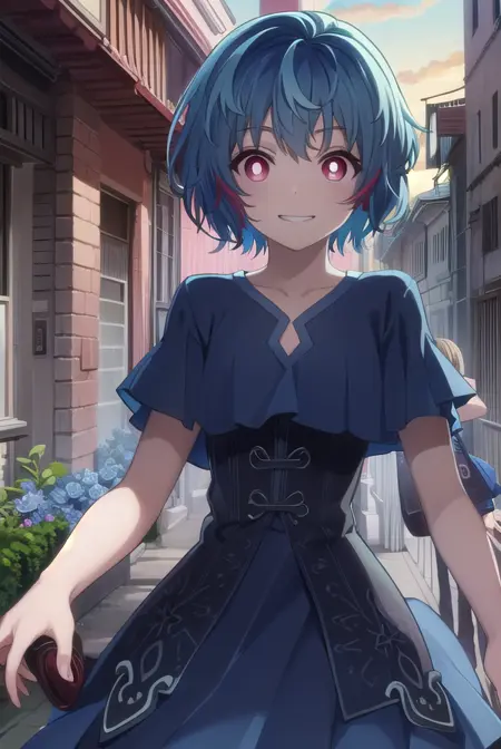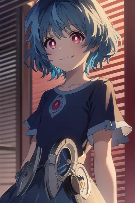 kohina hiruko, short hair, (red eyes:1.3), (bright pupils:1.5), streaked hair, blue hair,