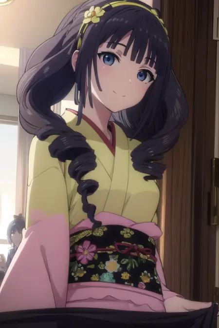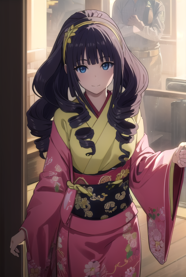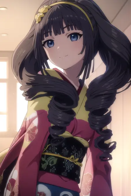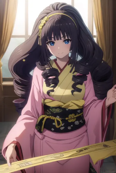 miori shiba, long hair, black hair, hair ornament, (black eyes:1.3), hairband, drill hair,