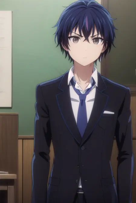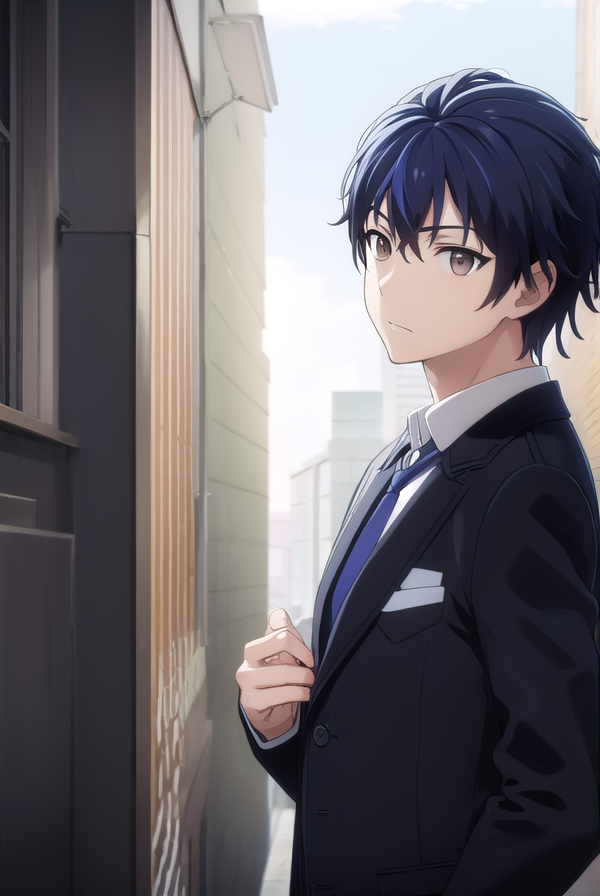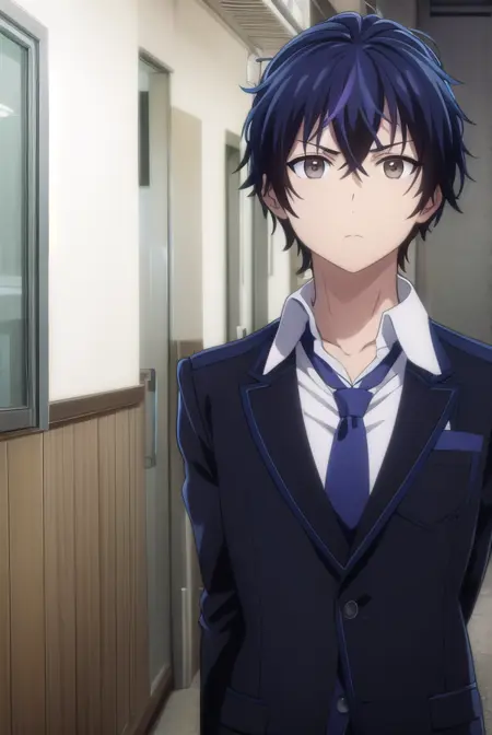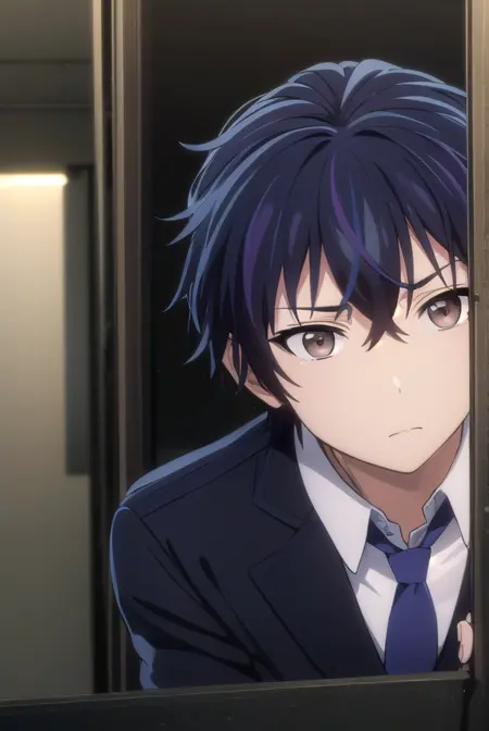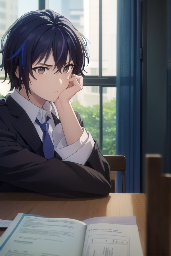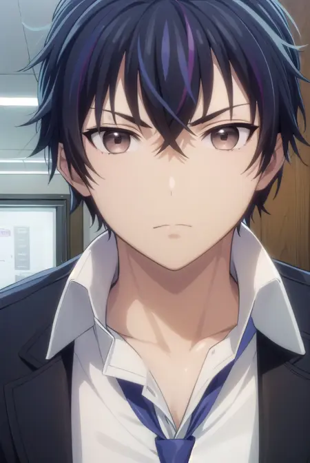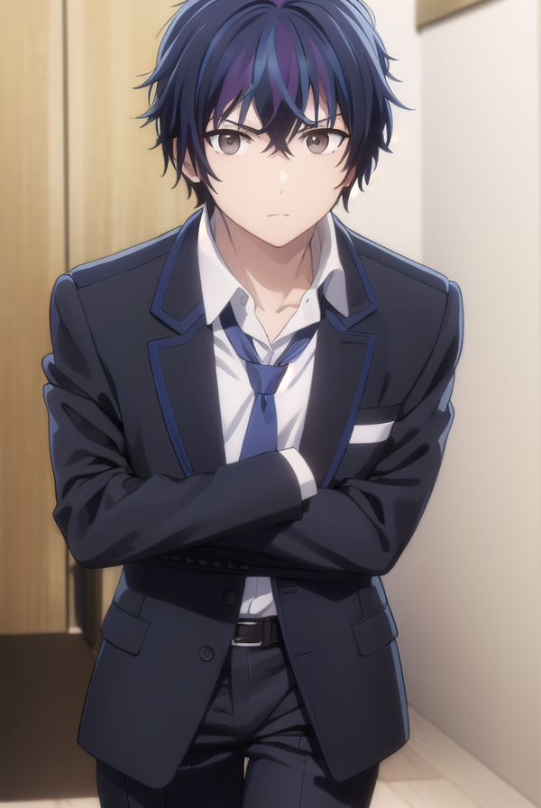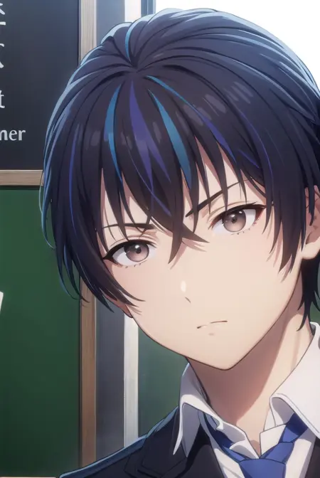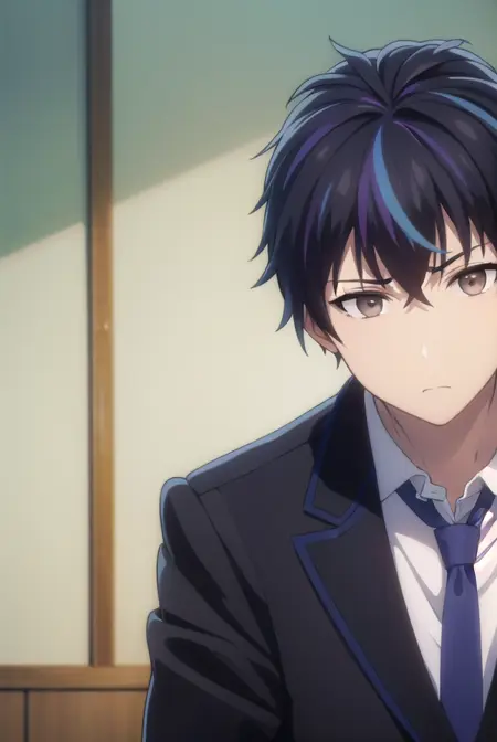rentarou satomi, black hair, blue hair, male focus, (brown eyes:1.5), streaked hair,