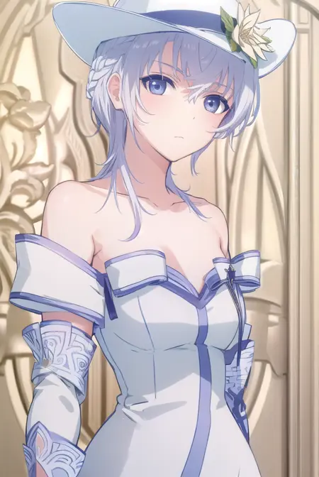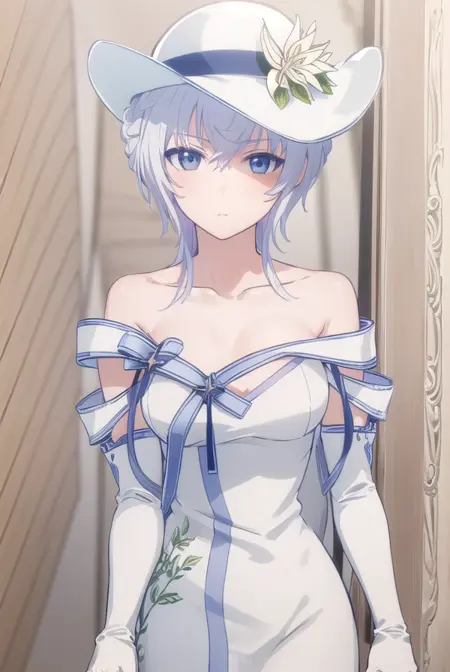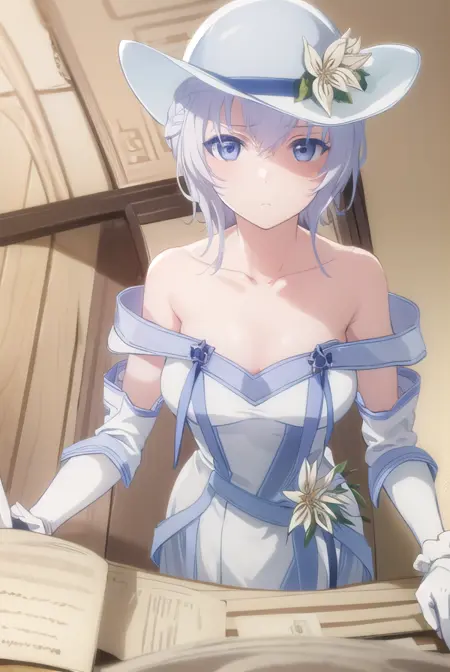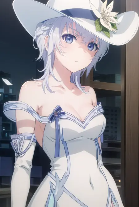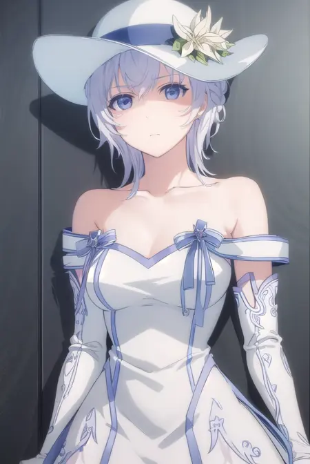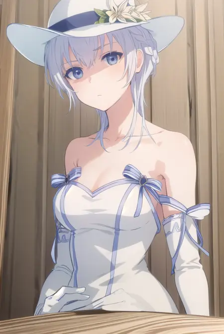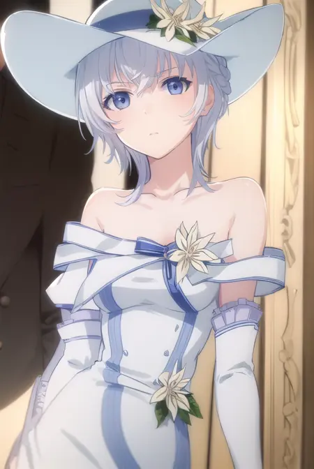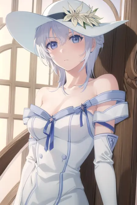 gloves, hat, dress, bare shoulders, collarbone, elbow gloves, white gloves, white dress, white headwear, sun hat, long dress, hat flower,
