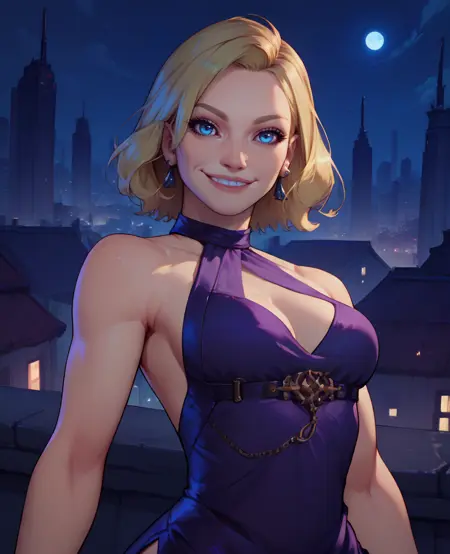 purple dress, cleavage, pelvic curtain, or skirt, black jacket, thighhighs, or thighboots, gloves, or gauntlets, or fingerless gloves, or asymmetrical gloves, jewelry,