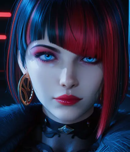annawxl, black hair, red streaked hair, blue eyes, medium hair, makeup,