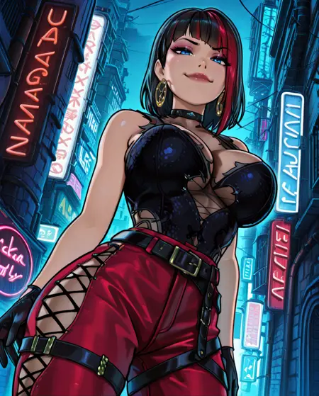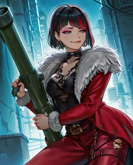 red coat, fur trim, black fishnet dress, cleavage, hoop earrings, choker, gloves, red pants, black belt,