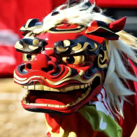 It is said that the lion dance was introduced to Japan from China and developed into a form unique to Japan. Usually performed by one or two performers, the lion's body is made of green cloth, and its head is made of wood, etc. It has a shiny red surface and a low, upturned snout. It is often performed at shrines and festivals, and there is also a custom of visiting private homes to dance and make the "biting gesture" to ward off evil spirits and bring good fortune.