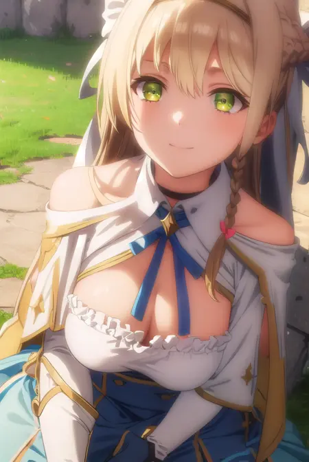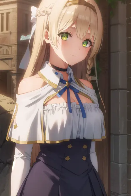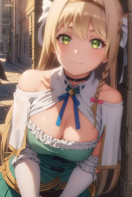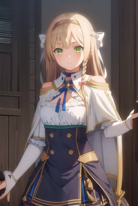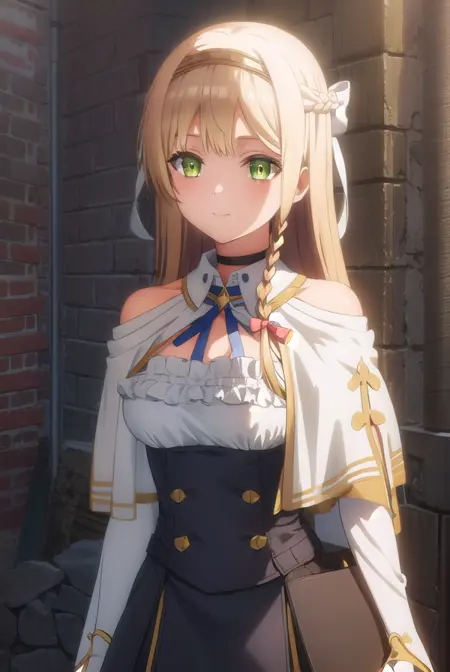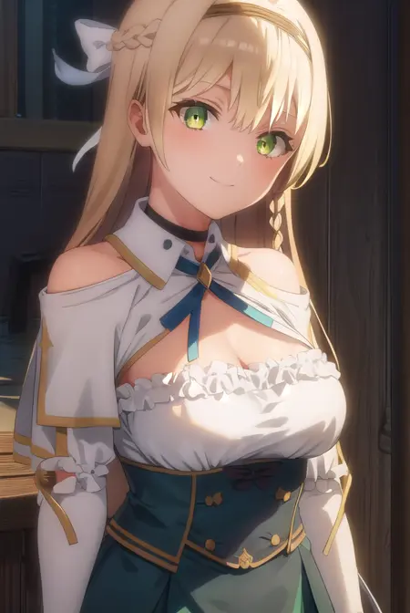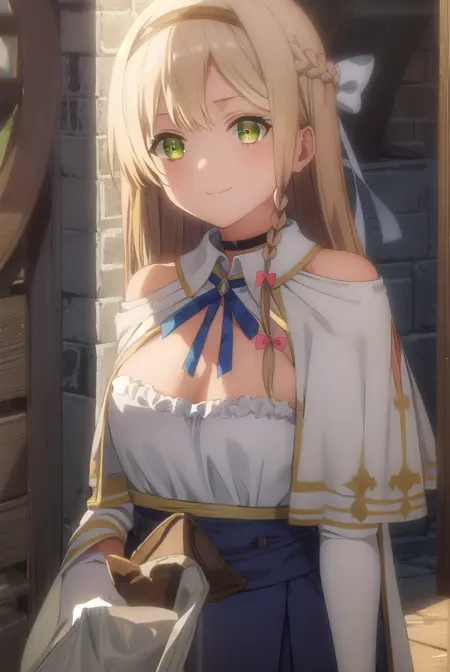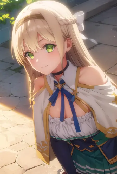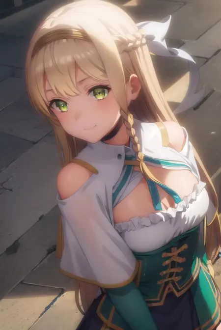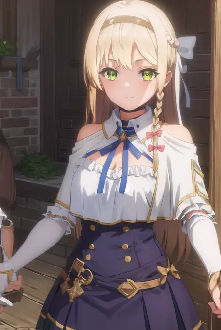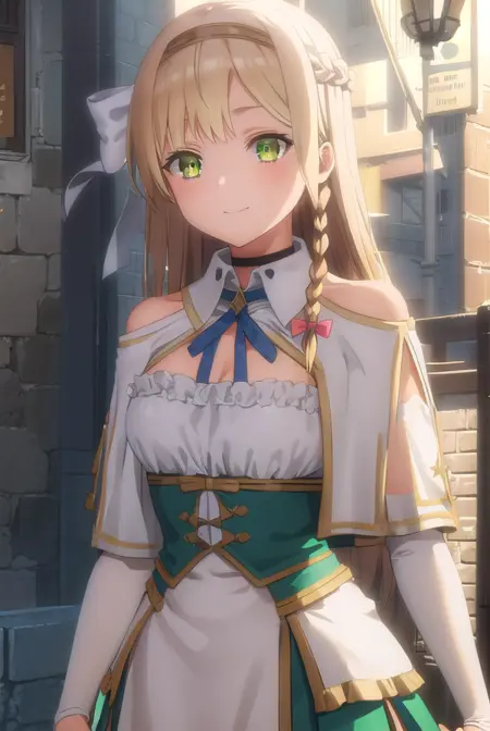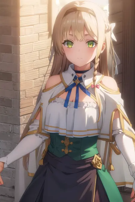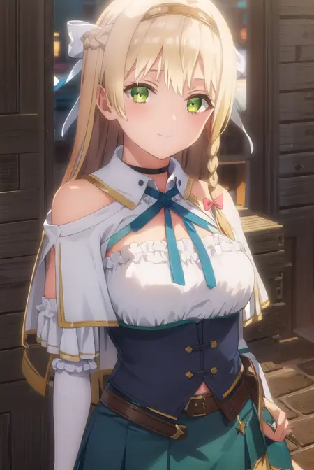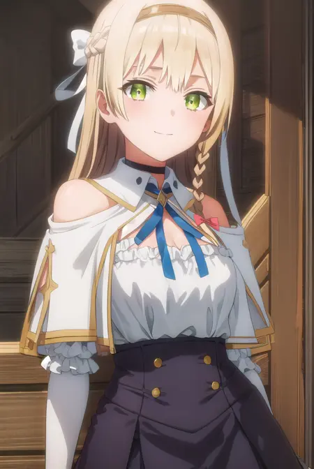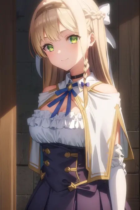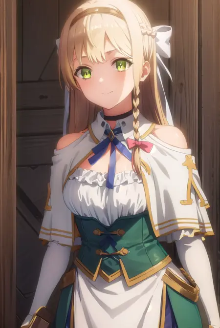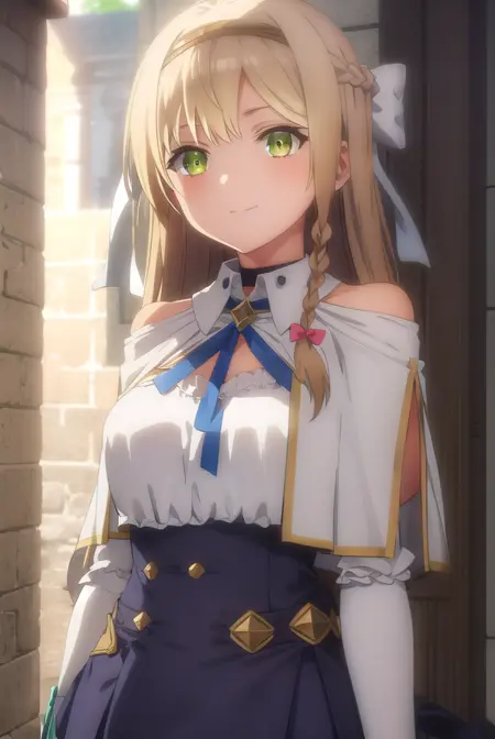 klaudia valentz, long hair, blonde hair, bow, ribbon, (green eyes:1.3), braid, hairband, side braid,