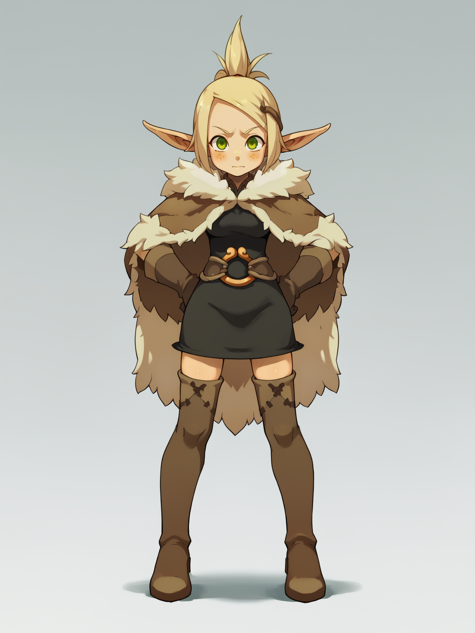 Season1 prompts : evangelyneyoung, blonde hair, hair ornament, green eyes, freckles, elf, fur cape, fur trim, belt, dress, gloves, thigh boots, thighhighs