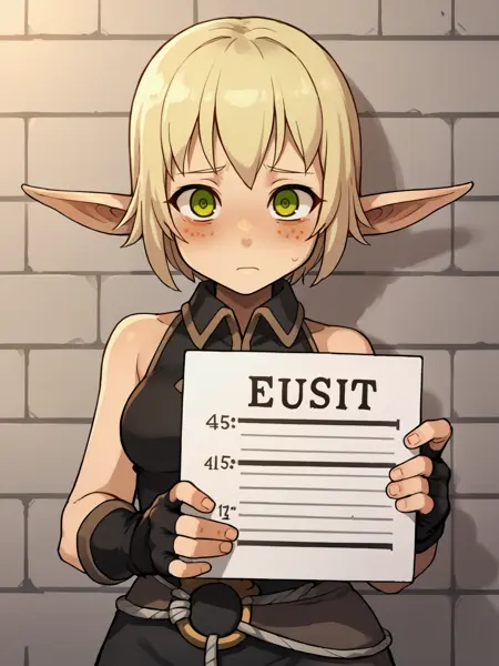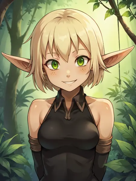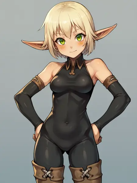 Season2 prompts : evangelyneold, blonde hair, short hair, green eyes, freckles, elf, belt, bare shoulders, bodysuit, fingerless elbow gloves, thigh boots, thighhighs