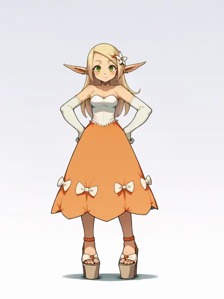 Season1 orange dress prompts : evangelynedress, blonde hair, long hair, hair flower, hair ornament, green eyes, bare shoulders, strapless, dress, orange skirt, white elbow gloves, elf, high heels, platform footwear, sandals