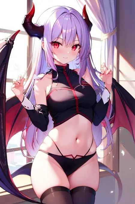 角色与服装使用:Arco,薰衣草色头发,背带裙,角,渐变染色,红眼睛,领结,过膝袜,吊袜带
