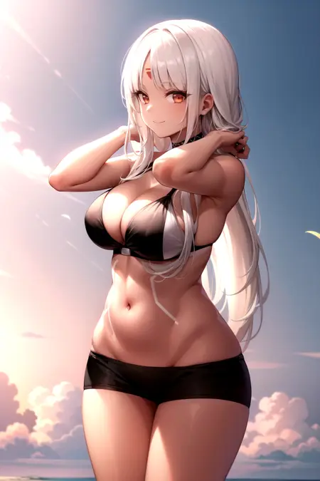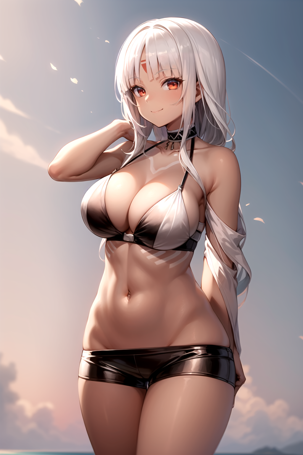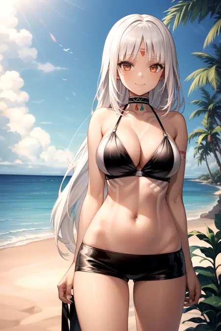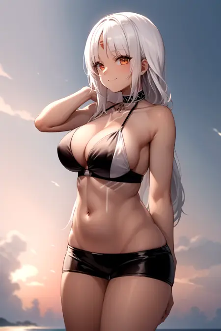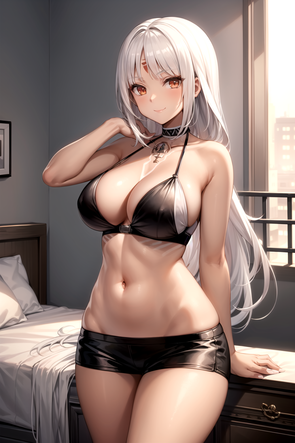 massachusetts_default: To get her main outfit. Use alongside with bikini, bikini top only, cleavage, choker, black choker, black jacket, open clothes, navel, short shorts, shorts, black shorts.