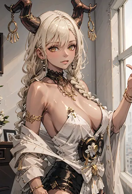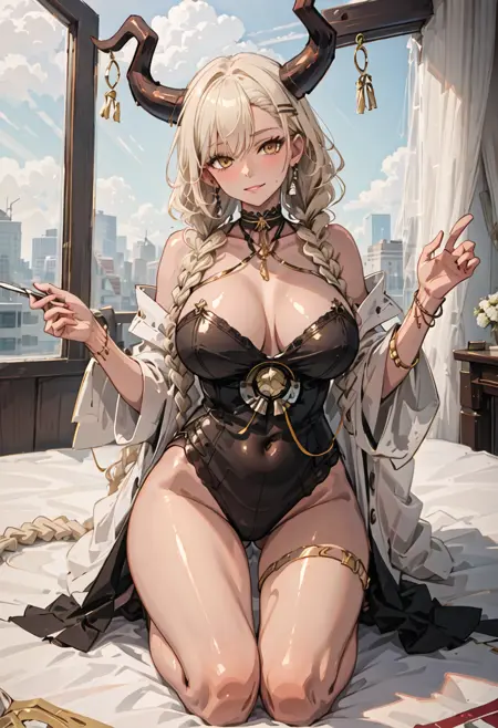 - 已精简的角色标签包括:breasts, long_hair, braid, hair_over_one_eye, horns, large_breasts, yellow_eyes, blonde_hair, mole, twin_braids, dark_skin, bangs, earrings, hair_ornament, very_long_hair, dark-skinned_female, mole_under_mouth, hairclip, huge_breasts。当角色的核心特征(例如发色)不够稳定时,您可以将这些标签添加到提示词中。