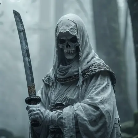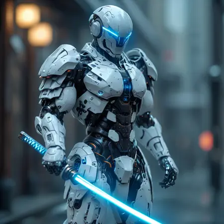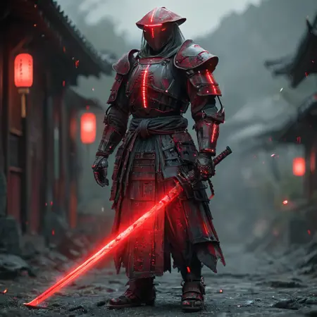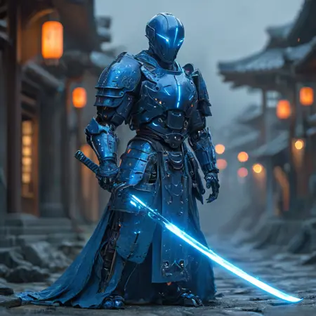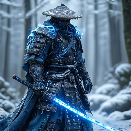 "a fullbody shot of a fantasy Samurai, holdin a glowing ice katana, HKStyle"
