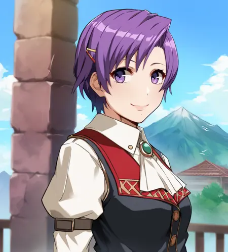 <lora:TrailsInTheSky-000023:0.9>, Klaudia von Auslese, 紫色头发, 短发, 紫色眼睛, 小胸, 发夹, 发饰, 领结, 紫色夹克, 百褶裙, 黑色连裤袜,