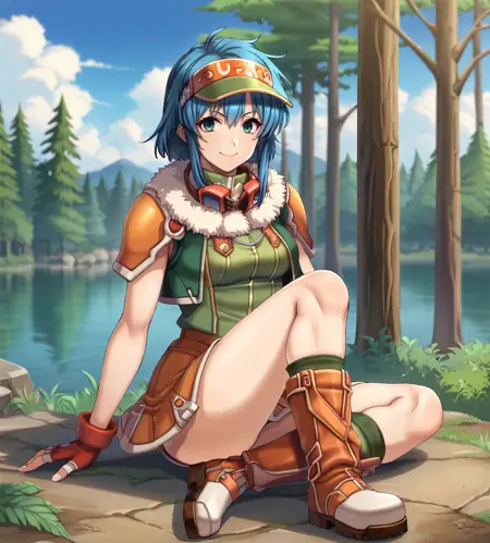 <lora:TrailsInTheSky-000023:0.9>, Josette Capua, 蓝色头发, 长发, 绿色眼睛, 中等胸部, 面罩帽, 眼镜挂在脖子上, 绿色夹克, 毛皮镶边, 肩部护甲, 肩甲, 橙色超短裙, 靴子,