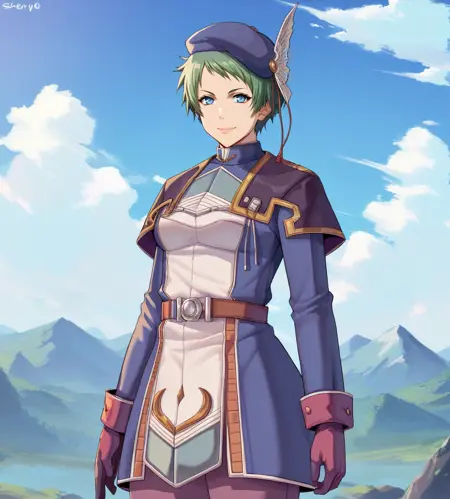 <lora:TrailsInTheSky-000023:0.9>, Julia Schwarz, 短发, 绿色头发, 蓝色眼睛, 中等胸部, 贝雷帽, 军装, 蓝色制服, 外套, 白色手套, 紫色长裤, 靴子,