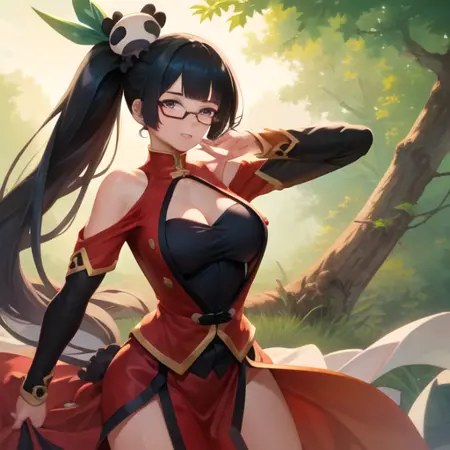 メガネ、中国服、カットアウト衣装、ポニーテール、サイドポニーテール、ドレス、パンダ、髪飾り、肩出し、杖、陰陽