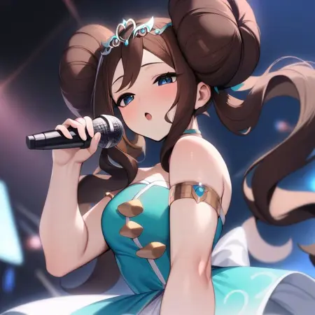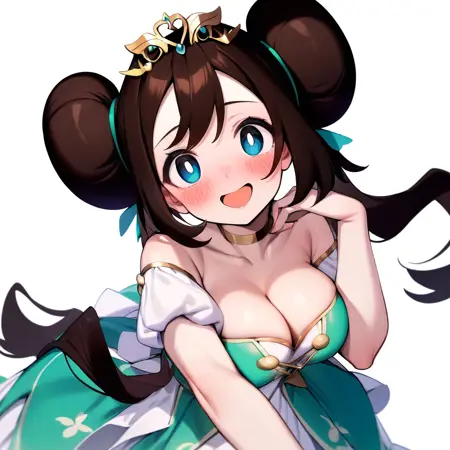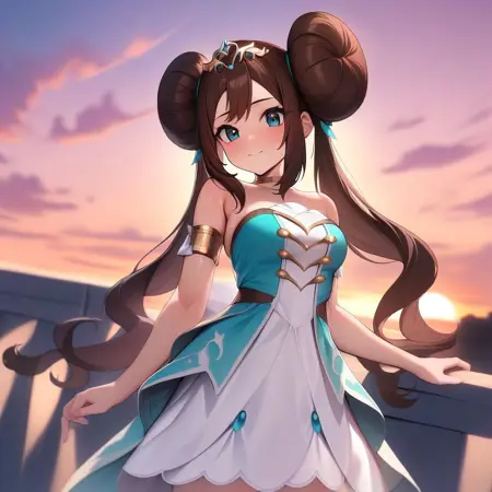 1girl, brown hair, blue eyes, double bun, twintails, long hair, wavy hair, tiara, aqua dress, white dress, strapless, armlet