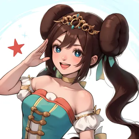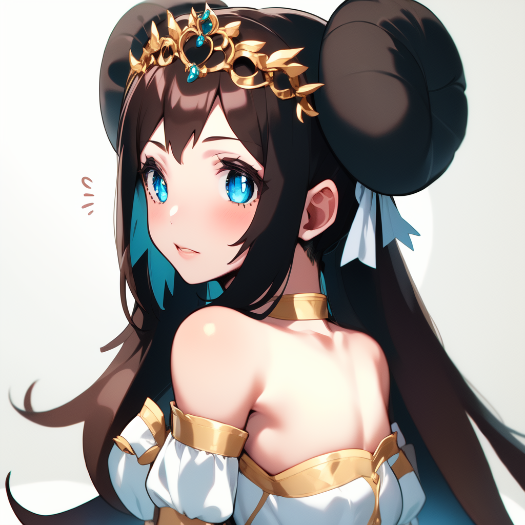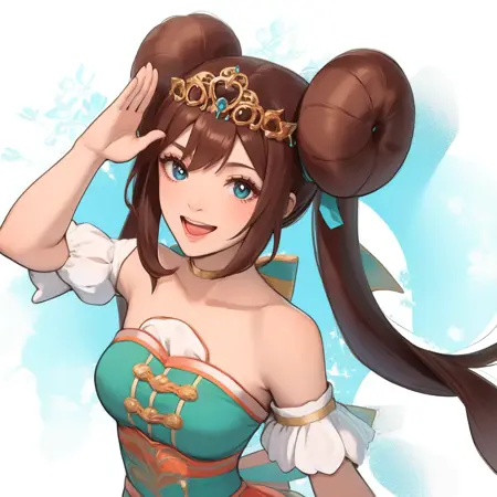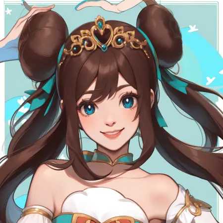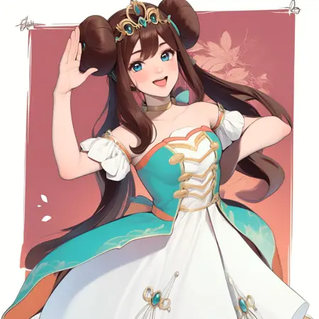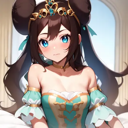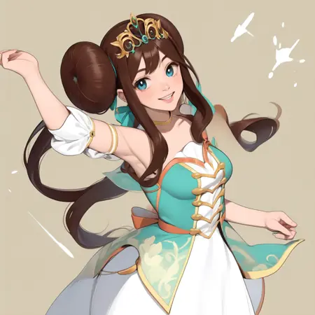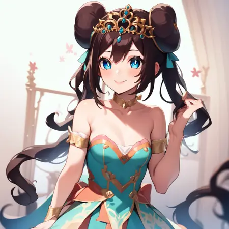 1girl, brown hair, blue eyes, double bun, twintails, long hair, wavy hair, tiara, aqua dress, white dress, strapless, armlet