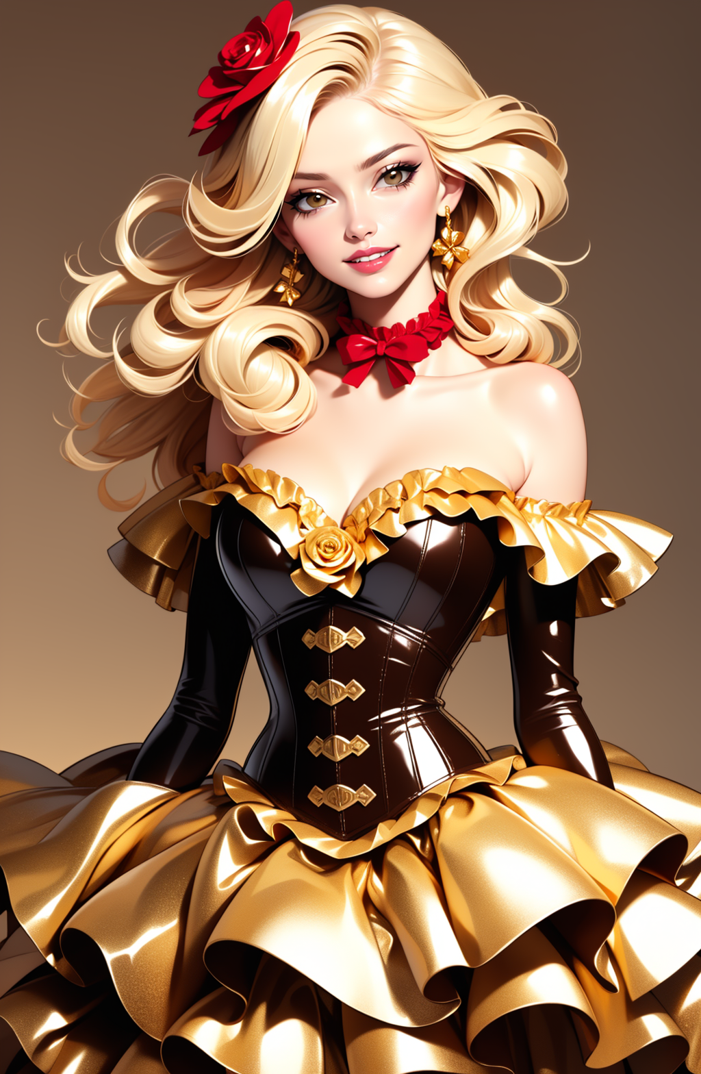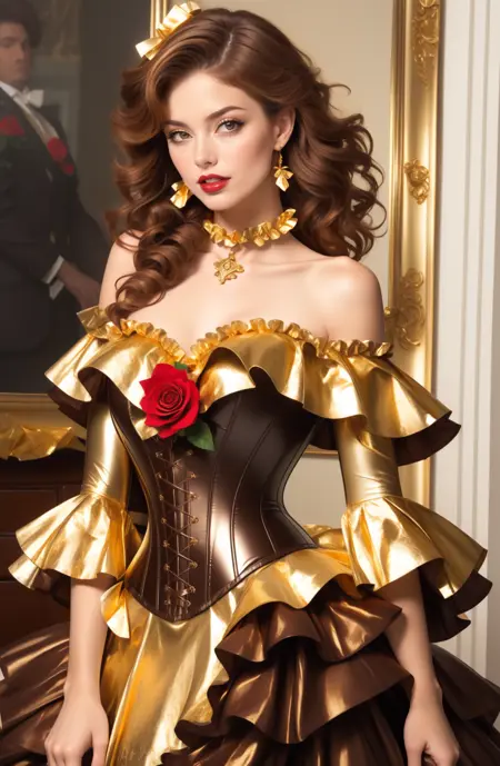 dr3ss, corset, dress, (crinkled gold foil:1.2) frills, ribbon, delicious, ornate, (choker), off shoulder, layered gown, rose, hair flower, chest bow,