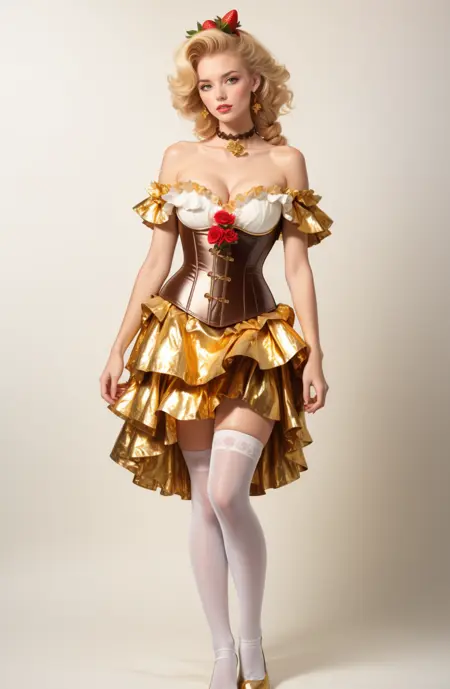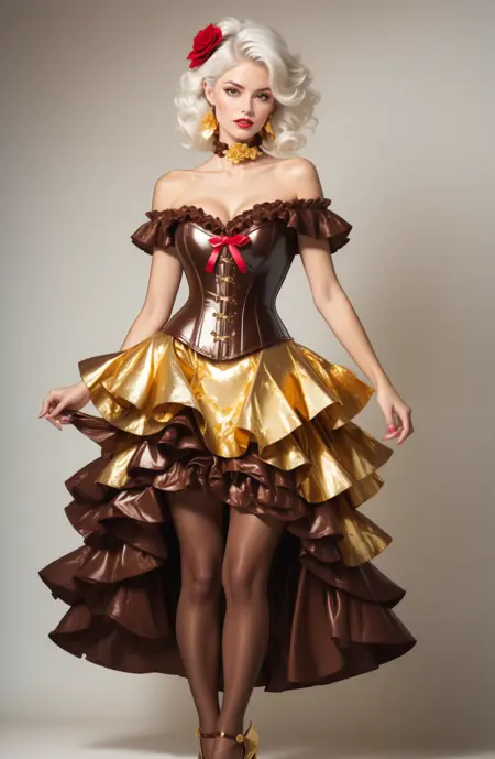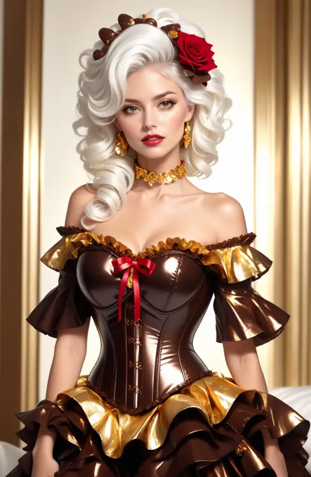 (((melted dark chocolate theme, whipped cream trim:1.4))), (white chocolate stockings) dr3ss, corset, dress, (crinkled gold foil:1.2) frills, ribbon, delicious, ornate, ( choker), off shoulder, layered gown, rose, hair flower, chest bow, large breasts, cleavage, breasts apart,
