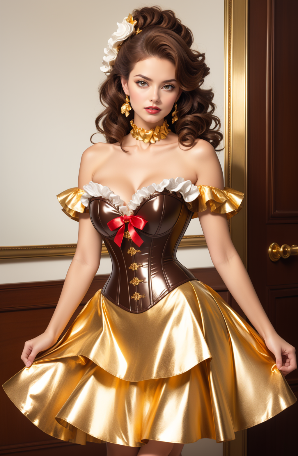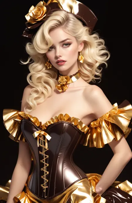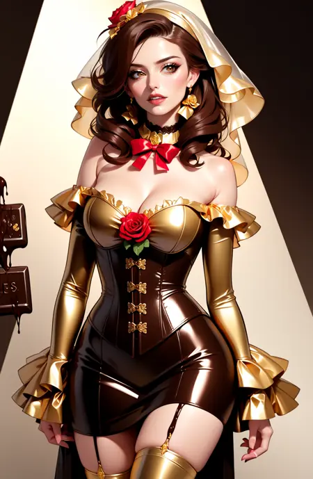 (((melted chocolate theme,))), dr3ss, corset, dress, (crinkled gold foil:1.2) frills, ribbon, delicious, ornate, ( choker), off shoulder, layered gown, rose, hair flower, chest bow, large breasts, cleavage, breasts apart,