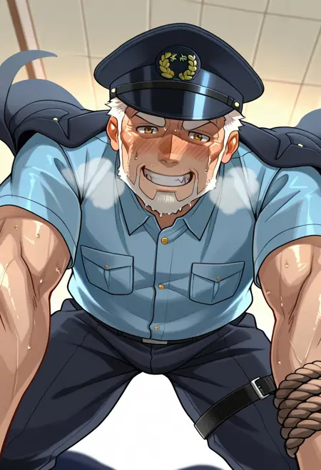 Prompt: white hair, short hair, gold eyes, white beard, Japanese police uniform, Japanese police hat, pure aqua-color collared shirt, pure aqua-color sleeves, (black jacket on shoulders), green wings, tengu-geta