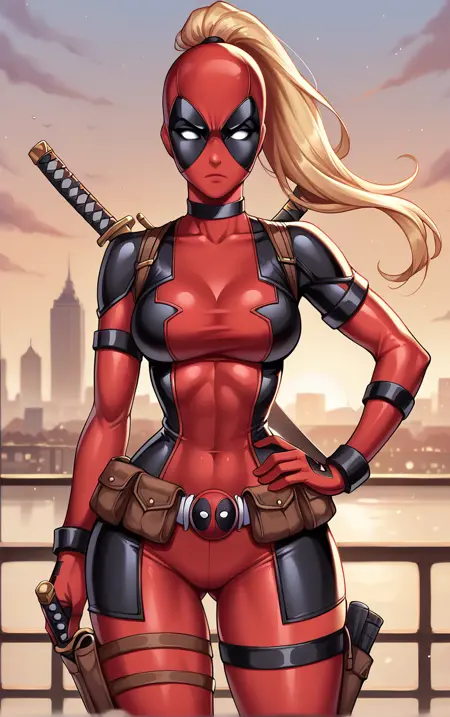 1girl, blonde hair, empty eyes, high ponytail, large breasts, masked, superhero, toned, very long hair, white eyes, mask, long hair, no pupils, narrow waist,