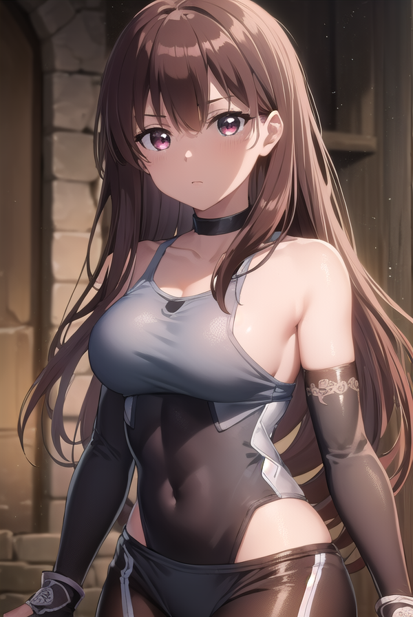 长发,过膝袜,手套,胸部暴露,裸露肩膀,项圈,露指手套,紧身衣,摔跤服,