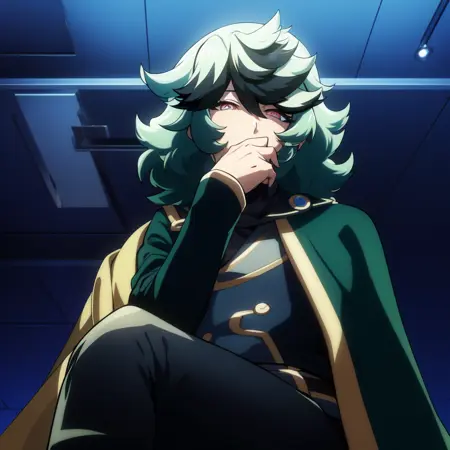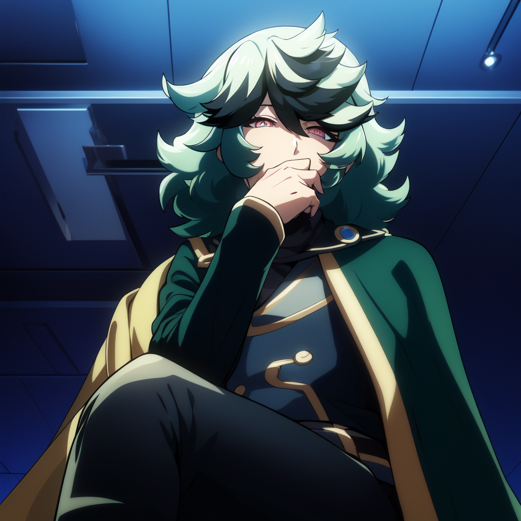 1boy, green hair, curly hair, black belt, black pants, jacket, multicolored eyes, side cape, black cape