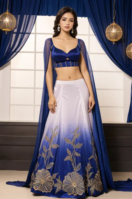 Floral Embroidered Lehenga (skirt) With Fitted Blouse, Draped Scarf