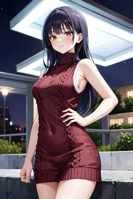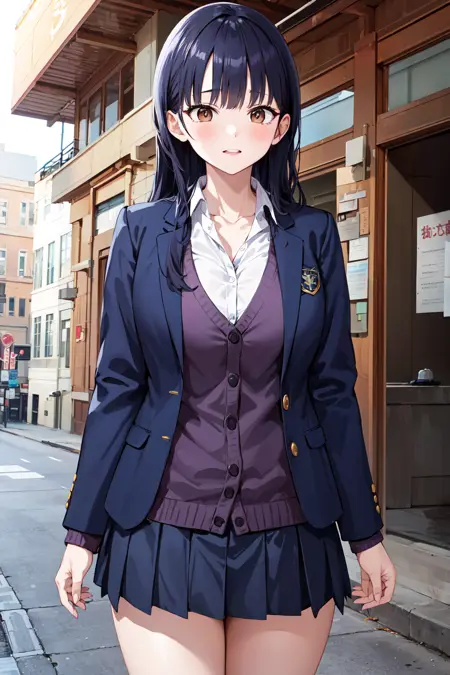 outfit2 (not perfect)aaanna, long hair, brown eyes, collarbone, collared shirt, purple sweater, blue jacket, blazer, open jacket, long sleeves, pleated skirt, blue skirt, miniskirt
