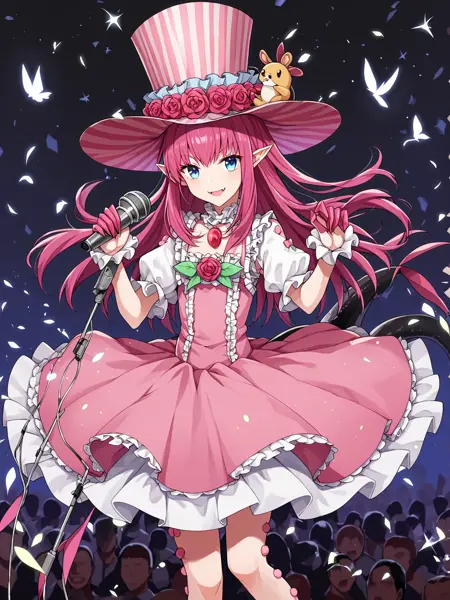 三次升华:lizthird,粉发,长发,尖耳,蓝眼,龙尾,粉裙,荷叶边裙,粉条纹高帽,帽饰花,裙饰花