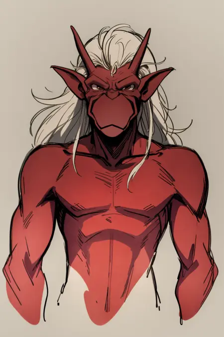 基础提示词:1boy, white hair, long hair, black eyes, red skin, belt, gargoyle, loincloth, wings, pointy ears, horns, tails, claws