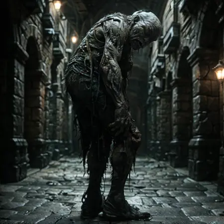 Hobbling behemoth of a man that smells like death is truly a bringer of disease, a lesser devil working for the earls and dukes to bring lingering decay on the living world. Horrific stench always accompanies the large, scabbed, bloody man beast, wet with sweat and boils covering their body.