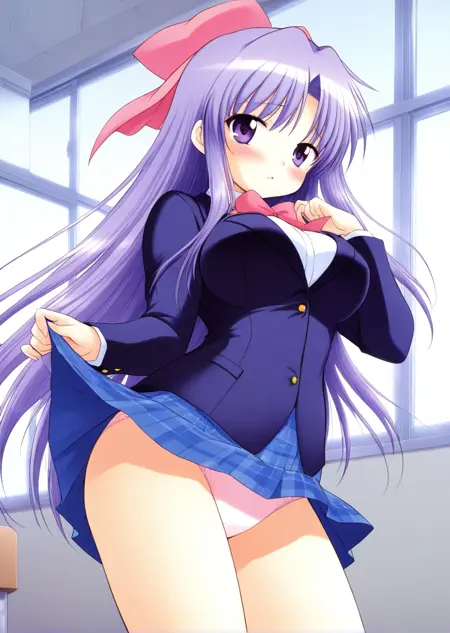 Yukino, 1girl, solo, 보라색 머리, 긴 머리, 거대한 가슴, 보라색 눈, 머리에 분홍색 리본,