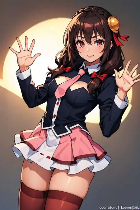 Default Outfit: pink necktie, long sleeves, pink skirt, thighhighs, cleavage