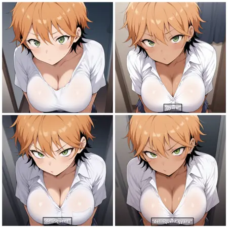 masterpiece,best quality,amazing quality, girlknaco, orange hair,green eyes,short hair,two-tone hair,large breasts,delinquent,gyaru