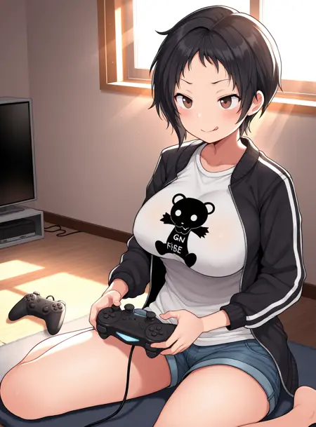 masterpiece, best quality, amazing quality, girlyumu, black hair, short hair, brown eyes,