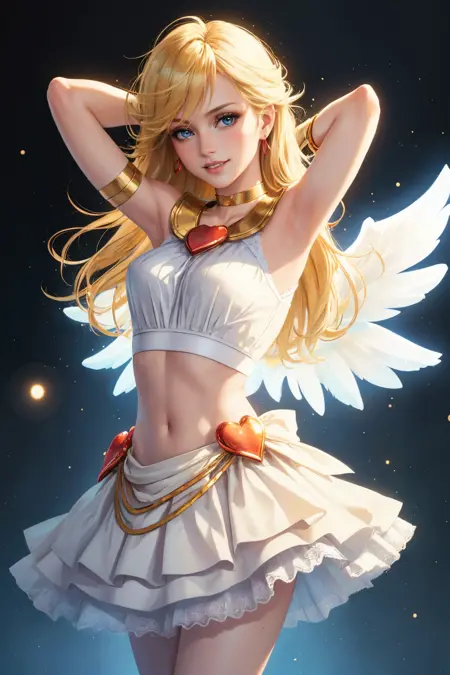 Angel Form: crop top, brooch, bridal gauntlets, white skirt, choker, armlet, bracelet, angel wings