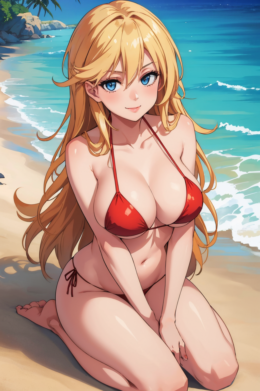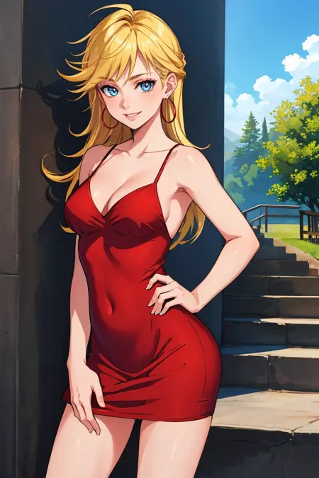 Default Outfit: red dress, sleeveless, hoop earrings, bare shoulders, cleavage