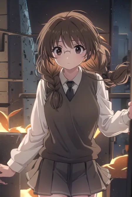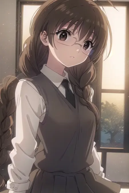 koi ui chigusa, 茶色の髪, (茶色の目:1.5), 眼鏡, 編み髪, 髪の編み髪, 単一の編み髪, 肩にかかる髪,