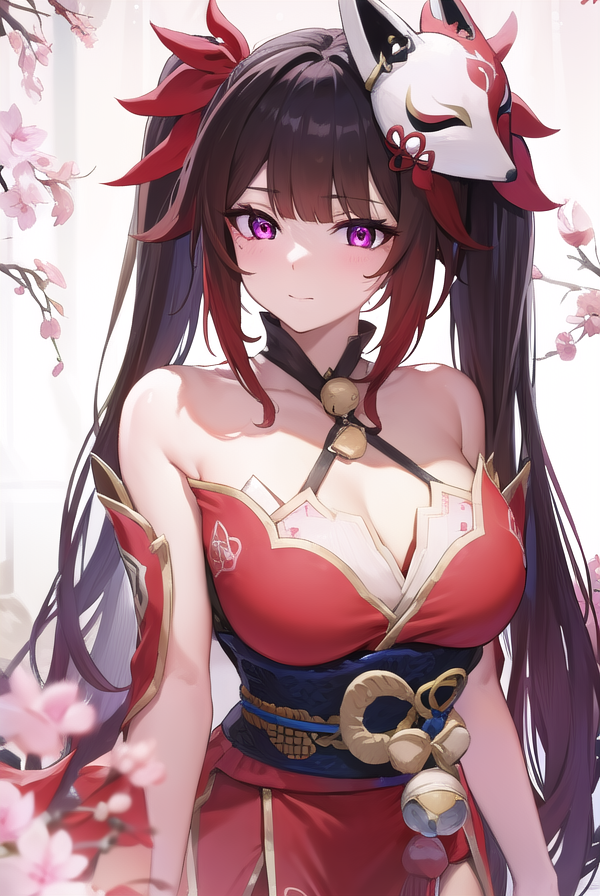 きらめき、長い髪、前髪、黒髪、髪飾り、ツインテール、(赤い目:1.3)、鈴、マスク、頭にマスク、狐のマスク、