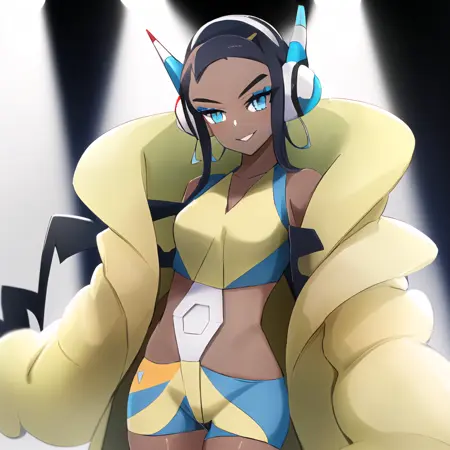 Clothing: headphones, headgear, navel, fur coat, yellow coat, open coat, coat, jacket, yellow jacket, open jacket, crop top, shorts, short shorts
