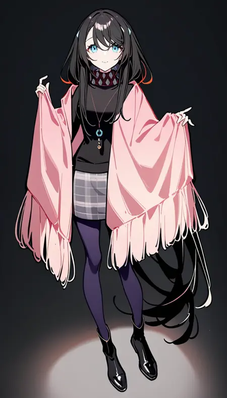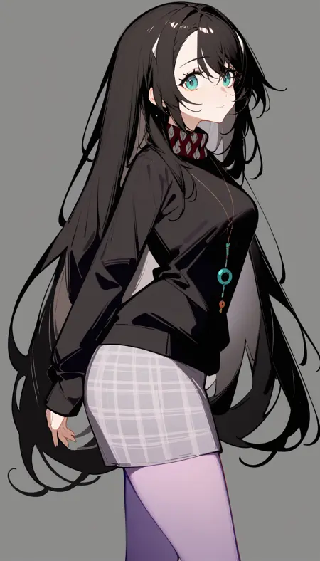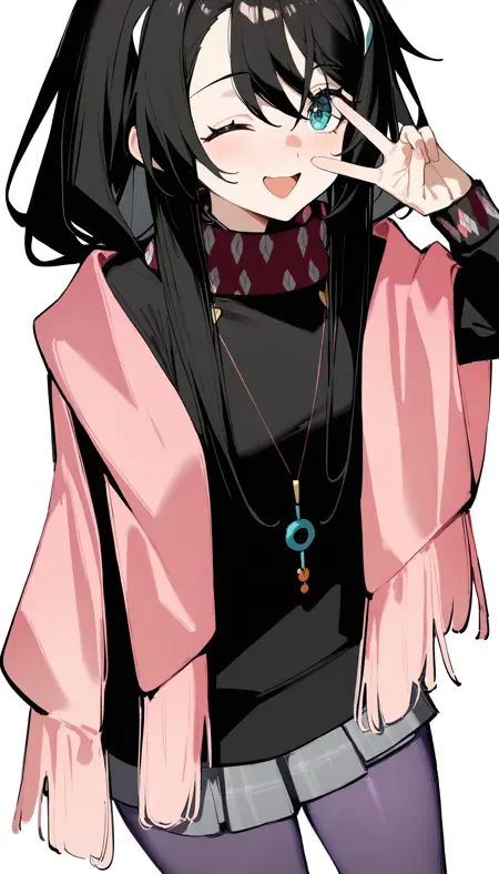 白いウィンドブレーカー:黒のパンスト、ボタン、チェック柄スカート、