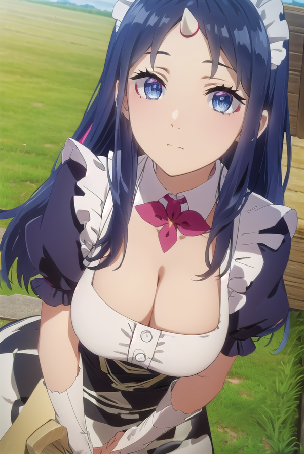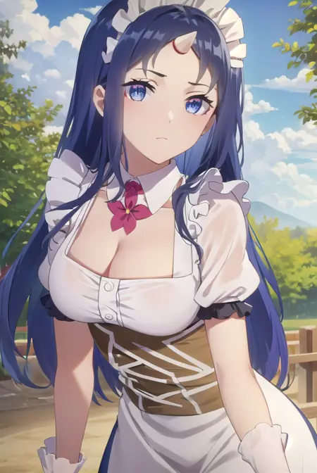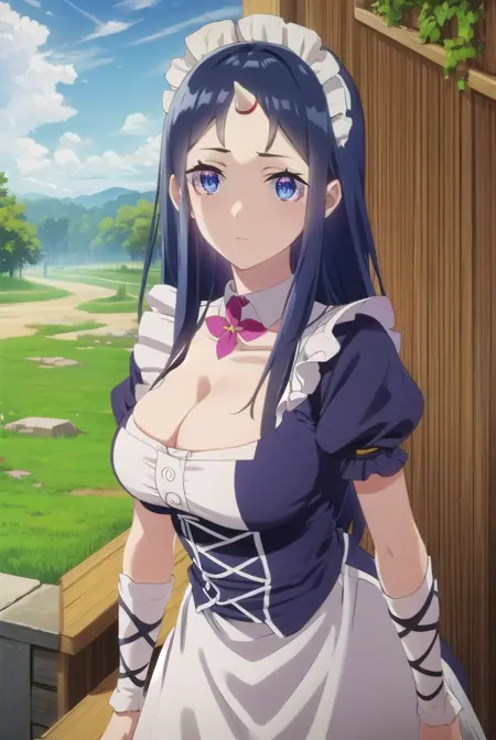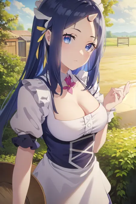 ann, long hair, blue eyes, blue hair, horns, single horn,